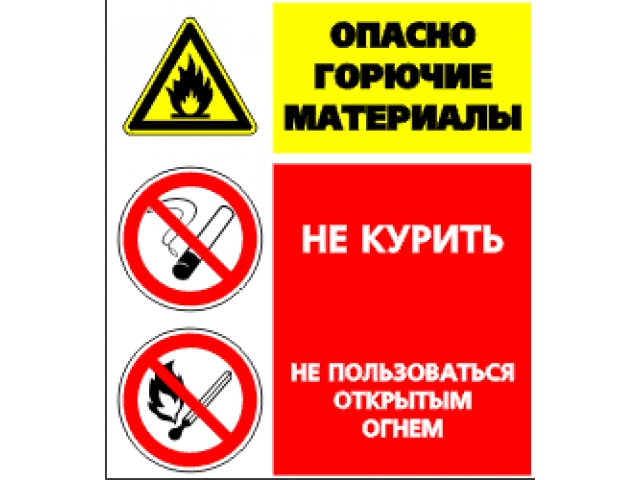 Опасно. Горючие материалы + Не курить + Не пользоваться открытым огнем